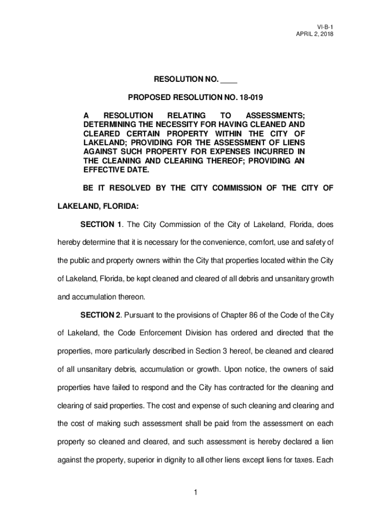 VIB1 APRIL 2, 2018RESOLUTION NO. PROPOSED RESOLUTION NO. 18019 A RESOLUTION RELATING TO ASSESSMENTS; DETERMINING THE NECESSITY FOR HAVING CLEANED AND CLEARED CERTAIN PROPERTY WITHIN THE CITY OF LAKELAND;