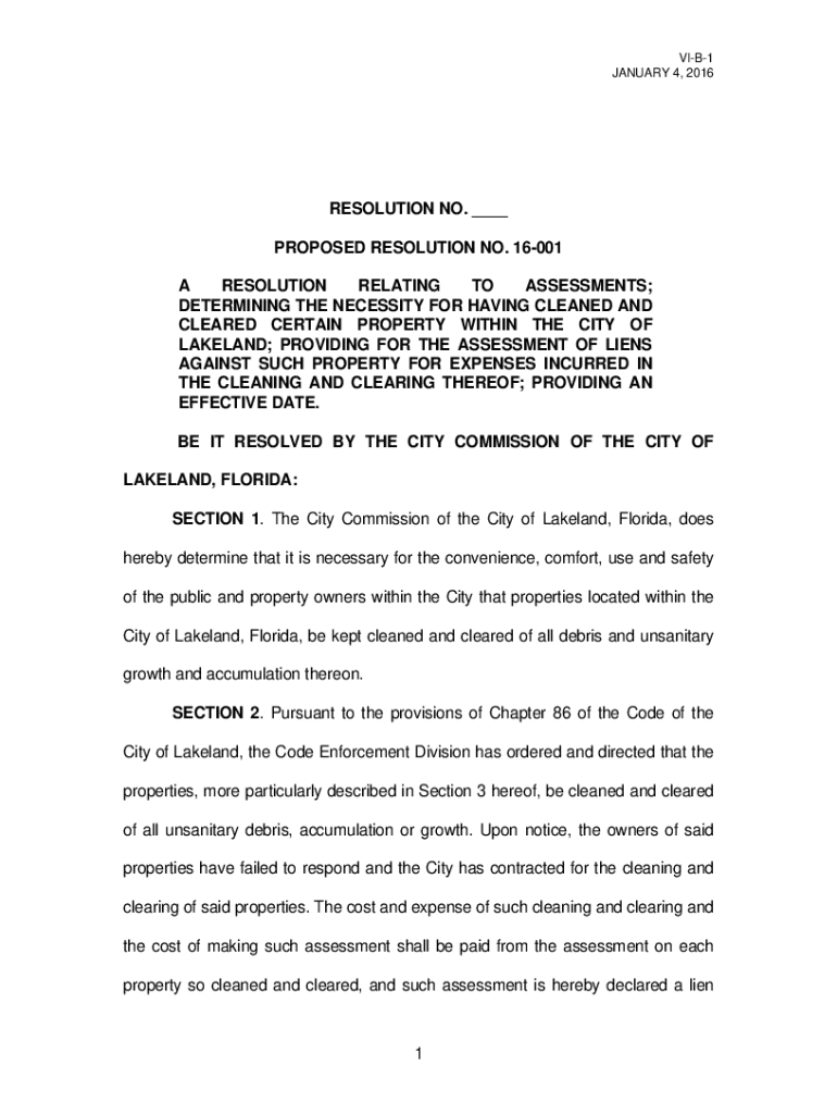 VIB1 JANUARY 4, 2016RESOLUTION NO. PROPOSED RESOLUTION NO. 16001 A RESOLUTION RELATING TO ASSESSMENTS; DETERMINING THE NECESSITY FOR HAVING CLEANED AND CLEARED CERTAIN PROPERTY WITHIN THE CITY OF