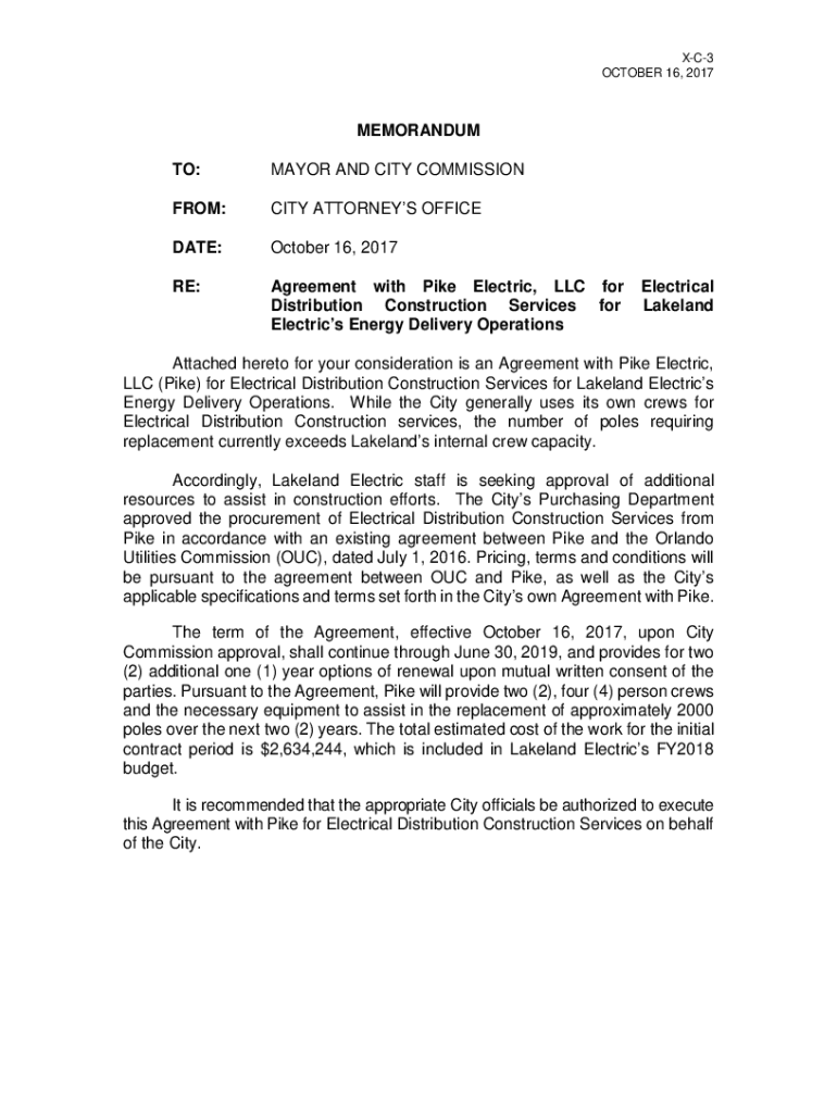 TO:MAYOR AND CITY COMMISSIONER:CITY ATTORNEYS OFFICIATE:October 16, 2017RE:Agreement with Pike Electric, LLC for
