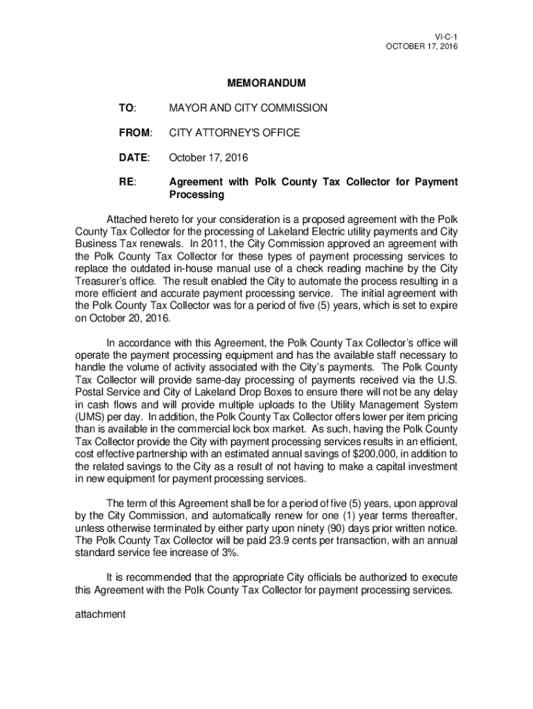 TO:MAYOR AND CITY COMMISSIONER:CITY ATTORNEY\'S OFFICIATE:October 17, 2016RE:Agreement with Polk County Tax Collector for Payment