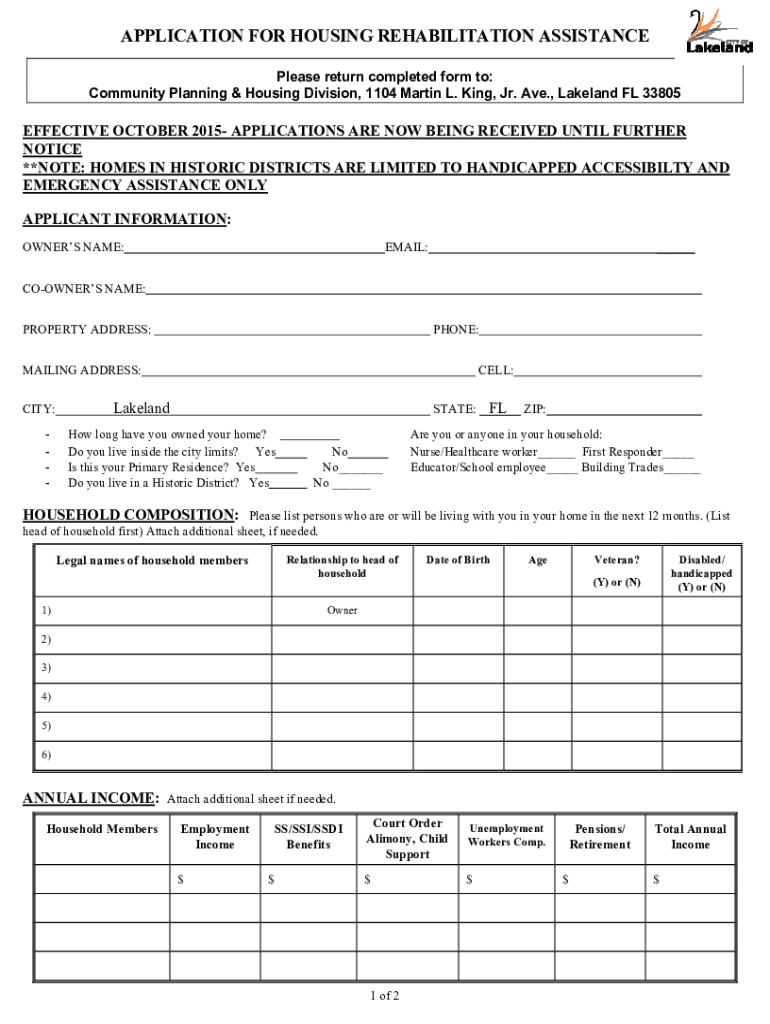 APPLICATION FOR HOUSING REHABILITATION ASSISTANCE Please return completed form to: Community Planning & Housing Division, 1104 Martin L. King, Jr. Ave., Lakeland FL 33805EFFECTIVE OCTOBER 2015 APPLICATIONS