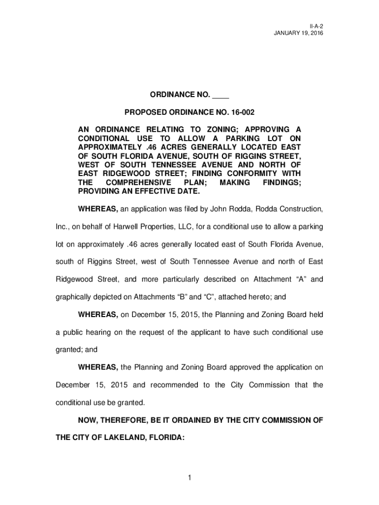 IIA2 JANUARY 19, 2016ORDINANCE NO. PROPOSED ORDINANCE NO. 16002 AN ORDINANCE RELATING TO ZONING; APPROVING A CONDITIONAL USE TO ALLOW A PARKING LOT ON APPROXIMATELY .46 ACRES GENERALLY LOCATED EAST