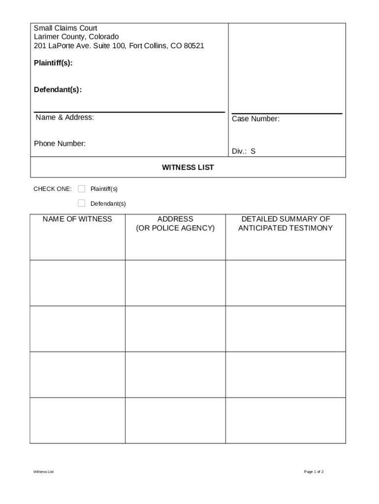 Any plaintiff involved in a small claims case in Larimer County, Colorado, is eligible to complete this form. Defendants may also need to submit a form if they plan to present witnesses.