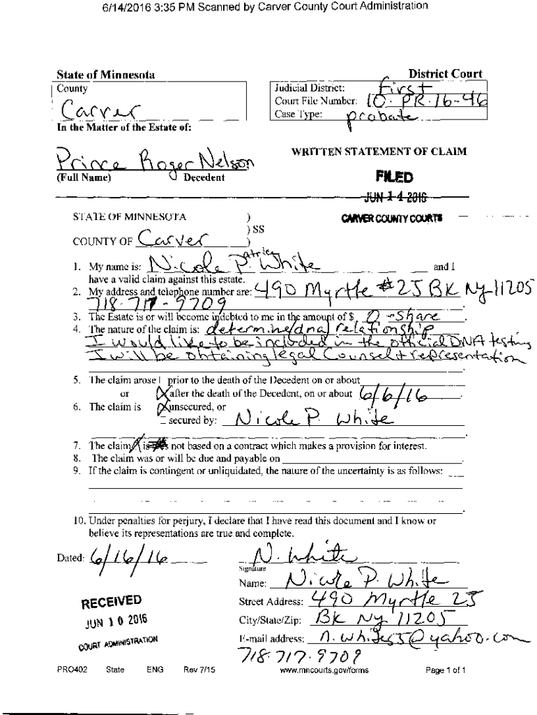 6/14/2016 3:35 PM Scanned by Carver County Court AdministrationDistrict Court, aristate of Minnesota CountyJudicial District:. CourtFileNumber:CM V JV((Full Name)FED state OF Minnesotan L&LvKikkMynameis: