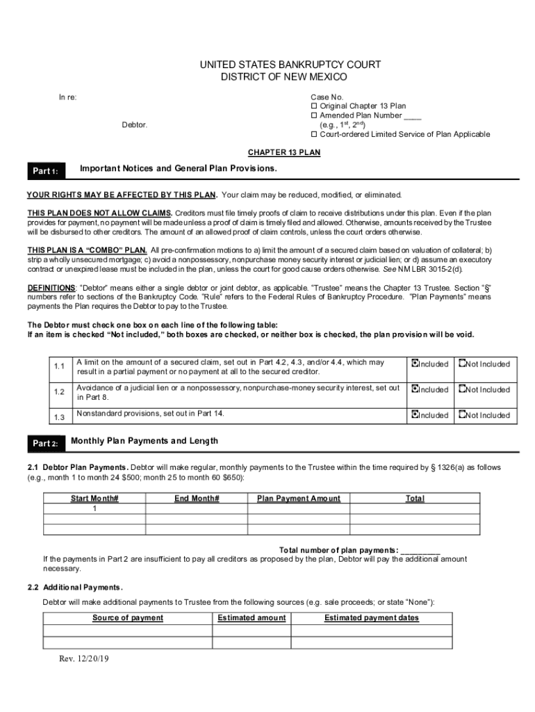 UNITED STATES BANKRUPTCY COURT DISTRICT OF NEW MEXICO In re:Case No. Original Chapter 13 Plan Amended Plan Number (e.g., 1st, 2nd) Court ordered Limited Service of Plan ApplicableDebtor. CHAPTER 13