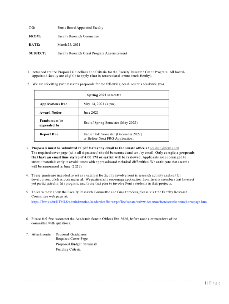 TO:Ferris BoardAppointed FacultyFROM:Faculty Research Committeeman:March 23, 2021SUBJECT:Faculty Research Grant Program Announcement1. Attached are the Proposal Guidelines and Criteria for the Faculty