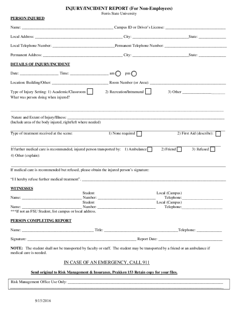 INJURY/INCIDENT REPORT (For Employees) Ferris State University PERSON INJURED Name: Campus ID or Driver's License: Local Address: City: State: Local Telephone Number: Permanent Telephone Number: Permanent