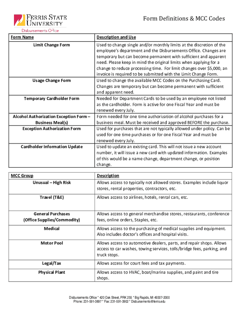Get the free Form Definitions & MCC Codes