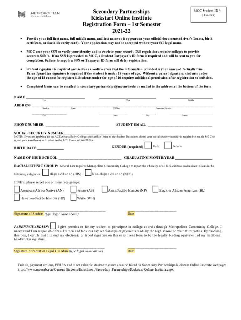 Secondary Partnerships Kick-start Online Institute Registration Form 1st Semester 202122MCC Student ID # (if known)Provide your full first name, full middle name, and last name as it appears on your