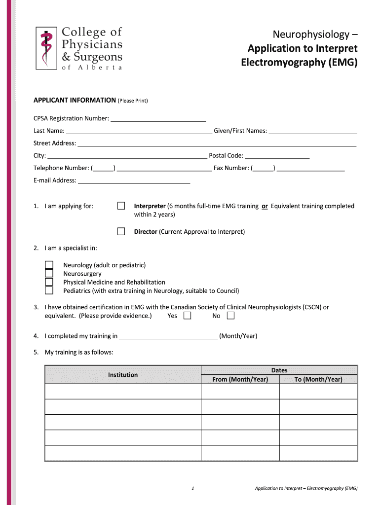 Neurophysiologist Application to Interpret Electromyography (EGG) APPLICANT INFORMATION (Please Print) CPA Registration Number: Last Name: Given/First Names: Street Address: City: Postal Code: Telephone