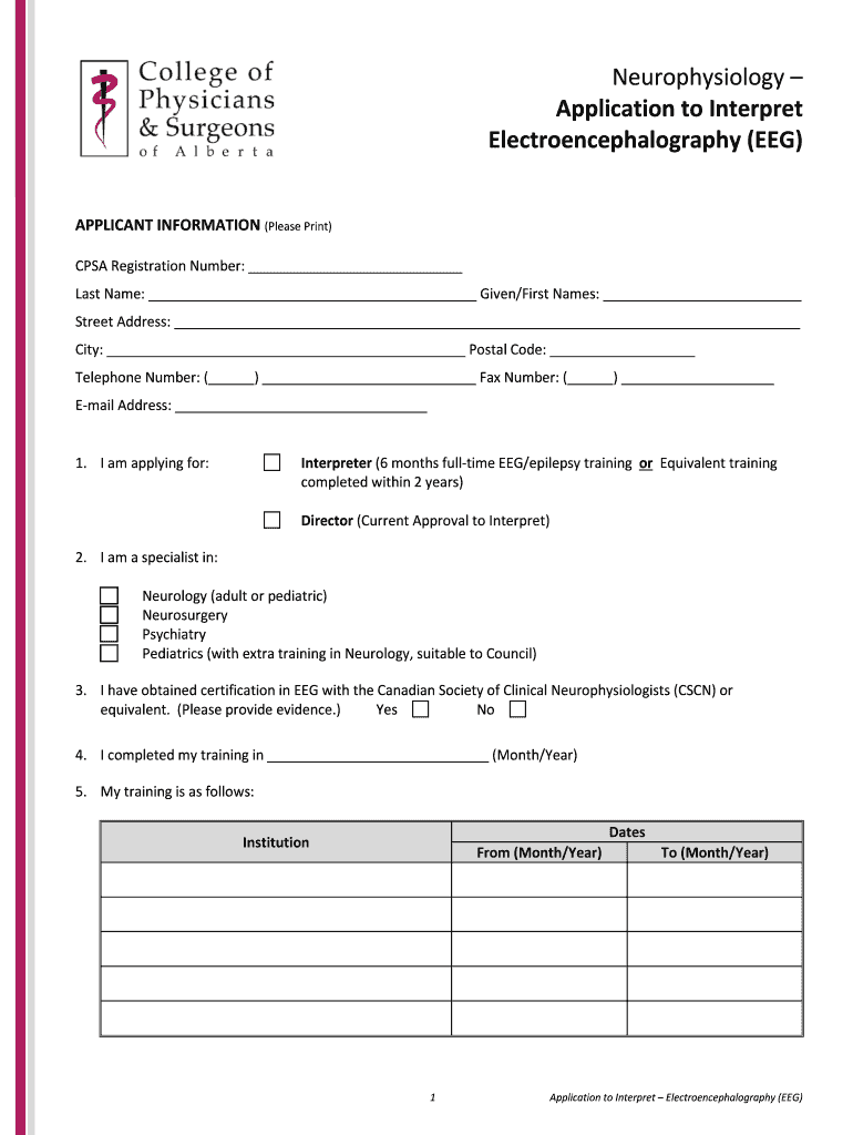 Neurophysiologist Application to Interpret Electroencephalography (EEG) APPLICANT INFORMATION (Please Print) CPA Registration Number: Last Name: Given/First Names: Street Address: City: Postal Code: