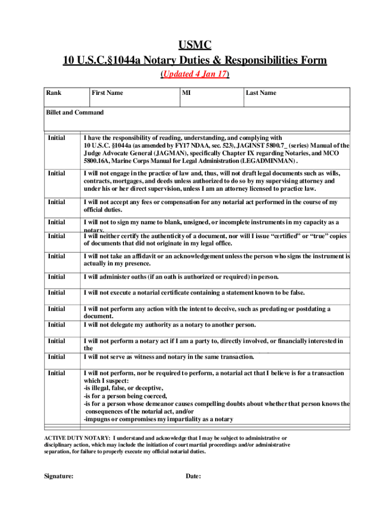 USMC 10 U.S.C.1044a Notary Duties & Responsibilities Form (Updated 4 Jan 17) Frankfurt NameMILast NameBillet and CommandInitialI have the responsibility of reading, understanding, and complying with
