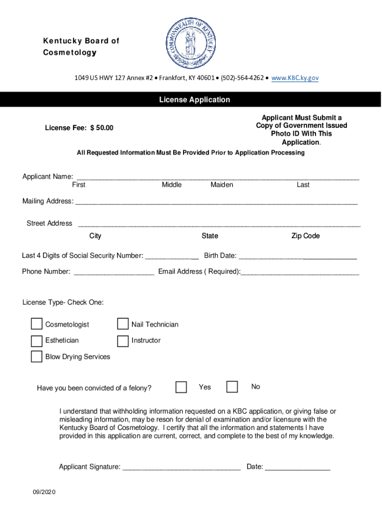 Kentucky Board of Cosmetology 1049 US HWY 127 Annex #2 Frankfort, KY 40601 (502)5644262 www.KBC.ky.govLicense Application Instructions Application Requirements: ALL requested information and fees