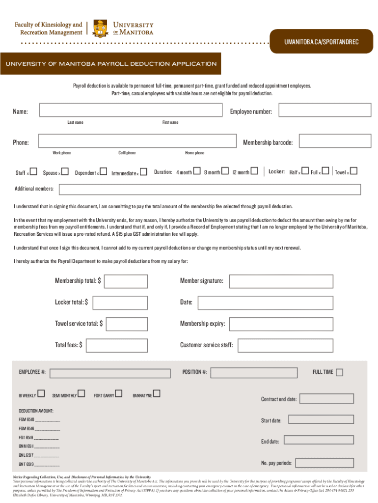Get the free UNIVERSITY OF MANITOBA PAYROLL DEDUCTION APPLICATION
