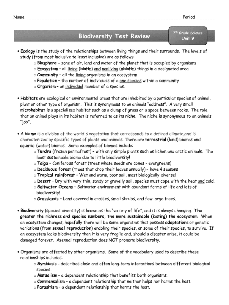 Name Period Biodiversity Test Review7th Grade ScienceUnit 9 Ecology is the study of the relationships between living things and their surrounds. The levels of study (from most inclusive to least inclusive)