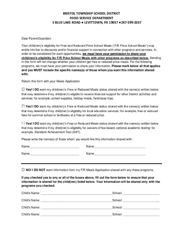 BRISTOL TOWNSHIP SCHOOL DISTRICT FOOD SERVICE DEPARTMENT 5 BLUE LAKE ROAD LEVITTOWN, PA 19057 2675992037Dear Parent/Guardian: Your child(men’s eligibility for Free and Reduced Price School Meals