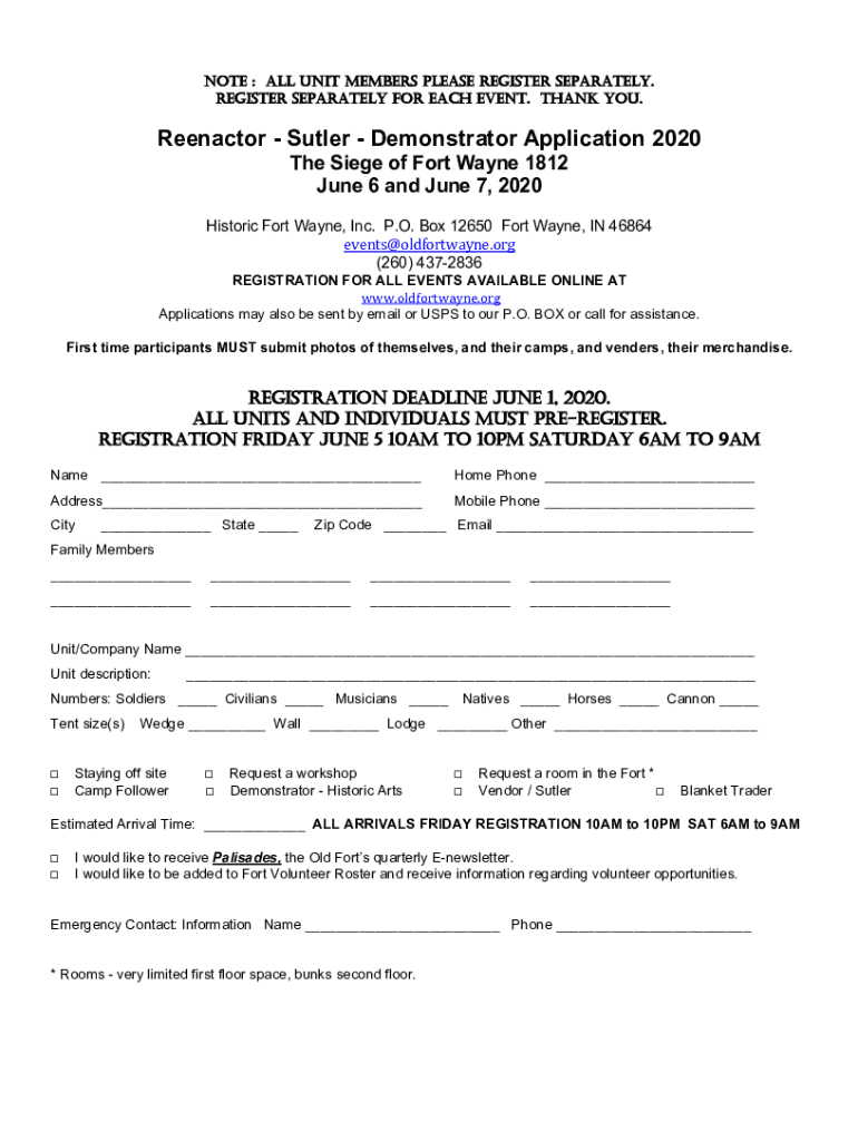 NOTE : ALL UNIT MEMBERS PLEASE REGISTER SEPARATELY. REGISTER SEPARATELY FOR EACH EVENT. THANK YOU. Reenact or Sutler Demonstrator Application 2020 The Siege of Fort Wayne 1812 June 6 and June 7, 2020,