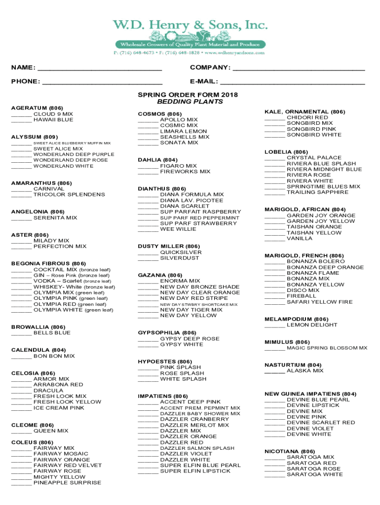 NAME: COMPANY: PHONE: EMAIL: SPRING ORDER FORM 2018 BEDDING PLANTS AGERATUM (806) CLOUD 9 MIX HAWAII BLUE ALYSSA (809) SWEET ALICE BLUEBERRY MUFFIN MIX SWEET ALICE MIX WONDERLAND DEEP PURPLE WONDERLAND