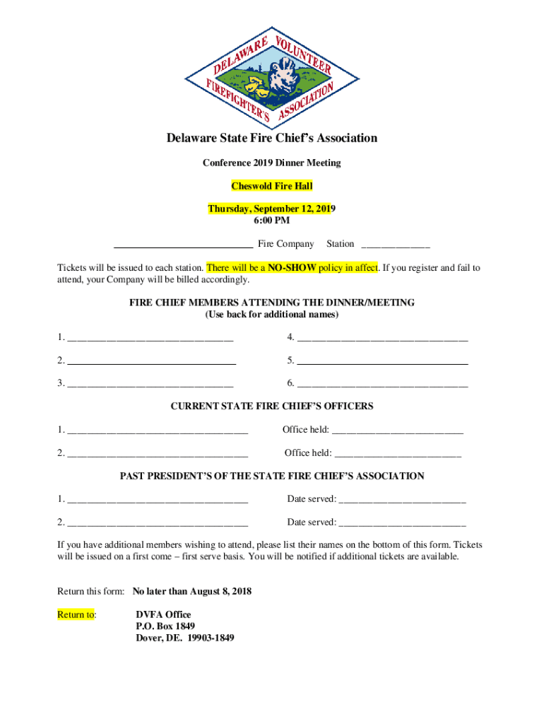Delaware State Fire Chiefs Association Conference 2019 Dinner Meeting Cotswold Fire Hall Thursday, September 12, 2019 6:00 PM Fire Compensation Tickets will be issued to each station. There will be