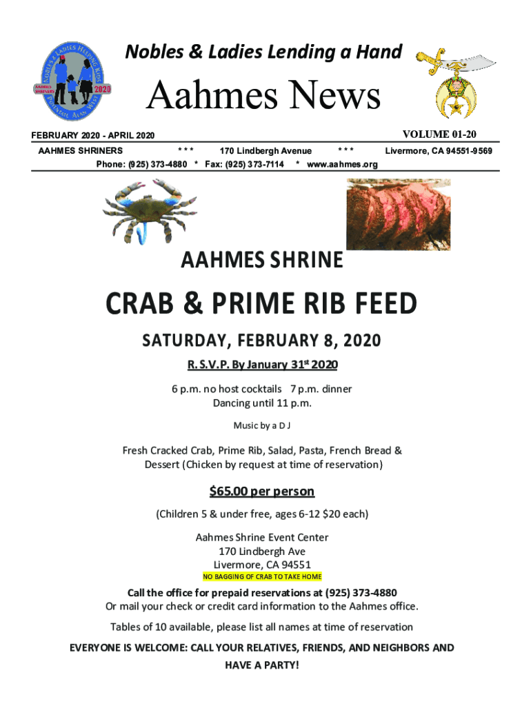 Nobles & Ladies Lending a Handshakes News VOLUME 0120FEBRUARY 2020 APRIL 2020AAHMES SHRINES *** 170 Lindbergh Avenue *** Livermore, CA 945519569 Phone: (925) 3734880 * Fax: (925) 3737114 * www.aahmes.orgAAHMES