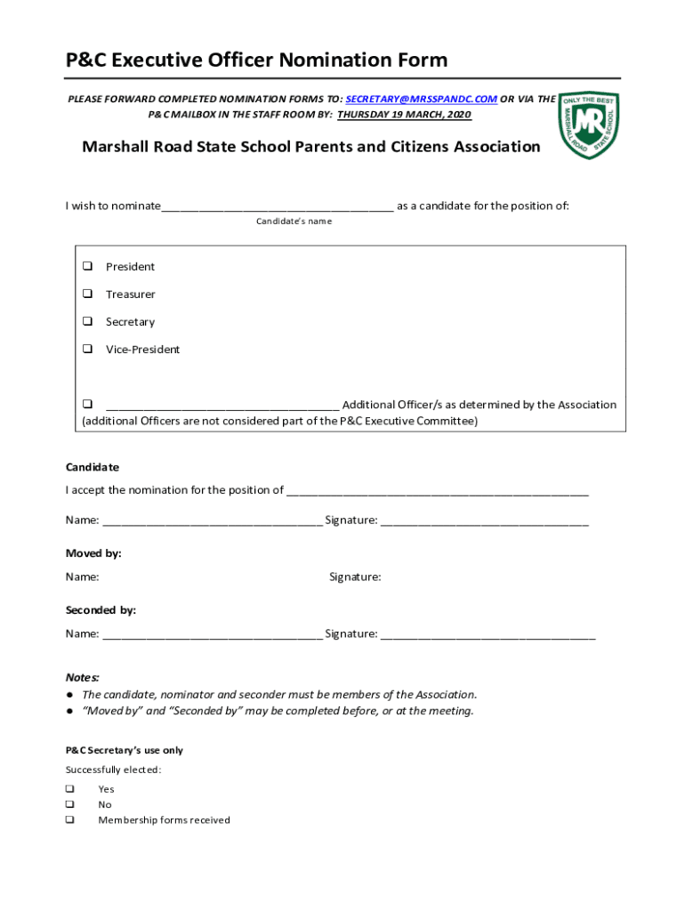 P&C Executive Officer Nomination Form PLEASE FORWARD COMPLETED NOMINATION FORMS TO: SECRETARY MRSSPANDC.COM OR VIA THE P&C MAILBOX IN THE STAFF ROOM BY: THURSDAY 19 MARCH, 2020Marshall Road State