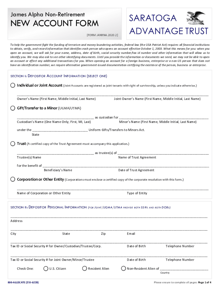 James Alpha NonRetirementNEW ACCOUNT FORM JANNA.2020.2 SARATOGA ADVANTAGE Trust help the government fight the funding of terrorism and money laundering activities, federal law (the USA Patriot Act)