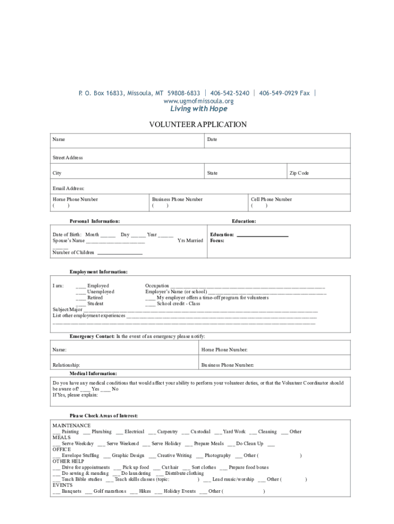 ! P. O. Box 16833, Missoula, MT 598086833 4065425240 www.ugmofmissoula.org4065490929 Living with HopeVOLUNTEER APPLICATION NameDateStreet Address CityStateZip Voicemail Address: Home Phone Number