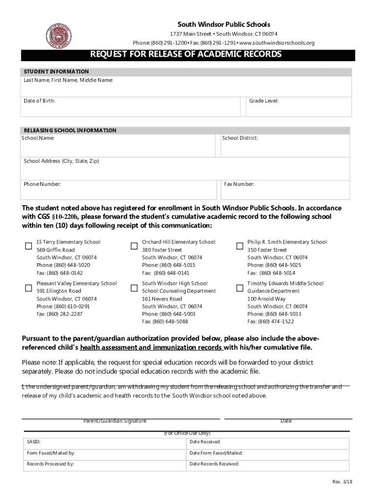 South Windsor Public Schools 1737 Main Street South Windsor, CT 06074 Phone: (860) 2911200 Fax: (860) 2911291 www.southwindsorschools.orgREQUEST FOR RELEASE OF ACADEMIC RECORDS STUDENT INFORMATION