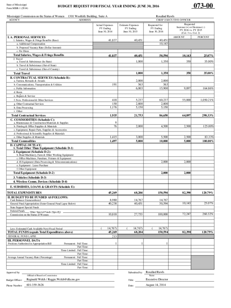 State of Mississippi Form MBR1 (2014)07300BUDGET REQUEST FOR FISCAL YEAR ENDING JUNE 30, 2016Mississippi Commission on the Status of Women1301 Wool folk Building, Suite AAGENCYRosalind RawlsADDRESSCHIEF