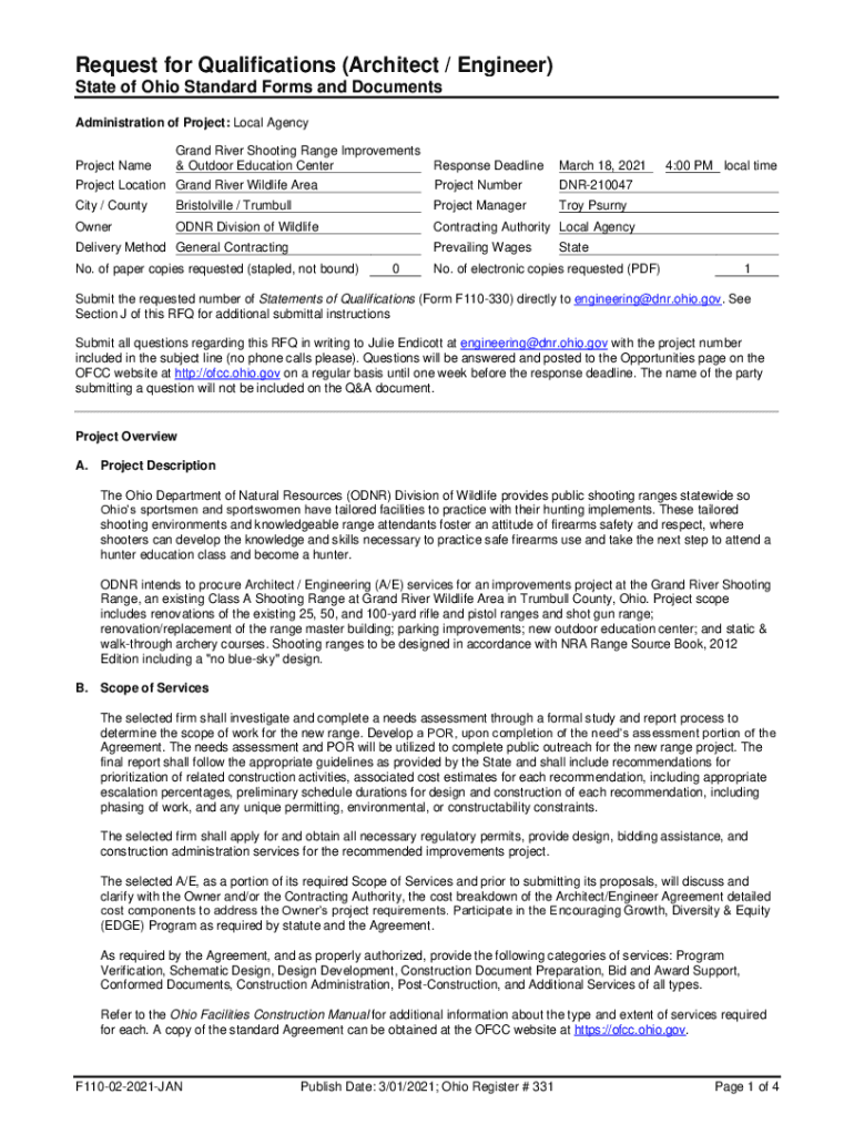 Request for Qualifications (Architect / Engineer) State of Ohio Standard Forms and Documents Administration of Project: Local Agency Project Amerind River Shooting Range Improvements & Outdoor Education