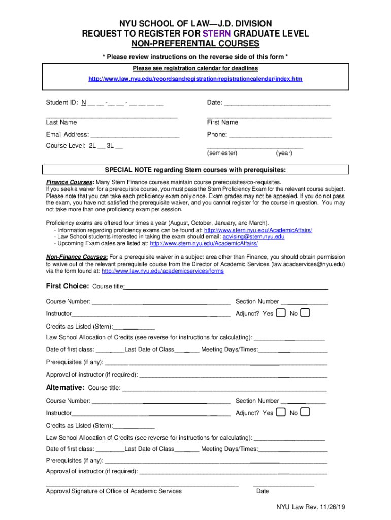 NYU SCHOOL OF LAW. D. DIVISION REQUEST TO REGISTER FOR STERN GRADUATE LEVEL PREFERENTIAL COURSES * Please review instructions on the reverse side of this form * Please see registration calendar for