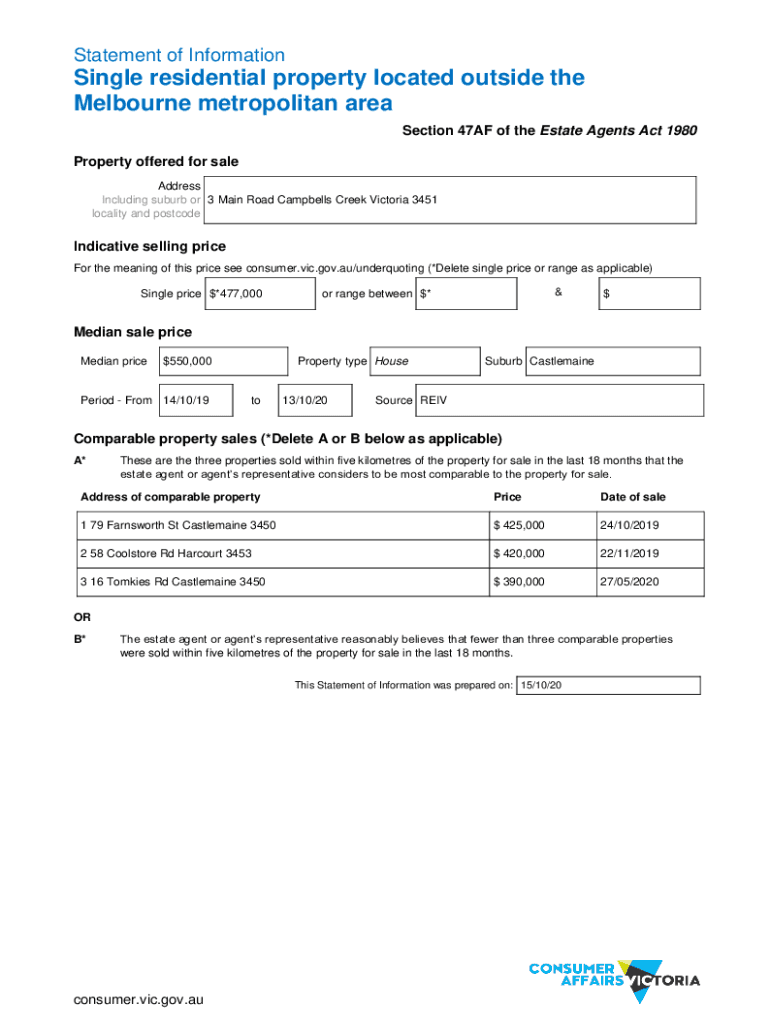 Statement of InformationSingle residential property located outside the Melbourne metropolitan area Section 47AF of the Estate Agents Act 1980 Property offered for sale Address Including suburb or