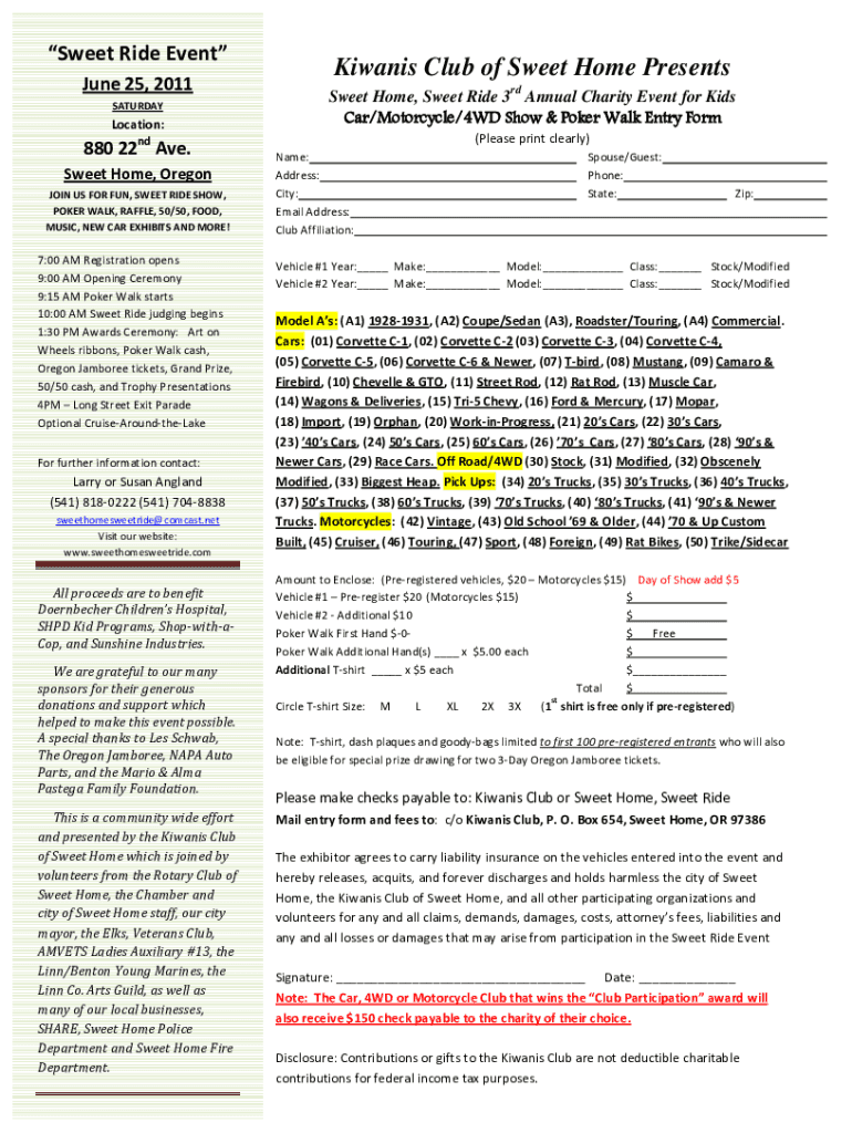 Sweet Ride Event June 25, 2011, SATURDAYLocation:880 22nd Ave. Sweet Home, Oregon JOIN US FOR FUN, SWEET RIDE SHOW, POKER WALK, RAFFLE, 50/50, FOOD, MUSIC, NEW CAR EXHIBITS AND MORE!7:00 AM Registration
