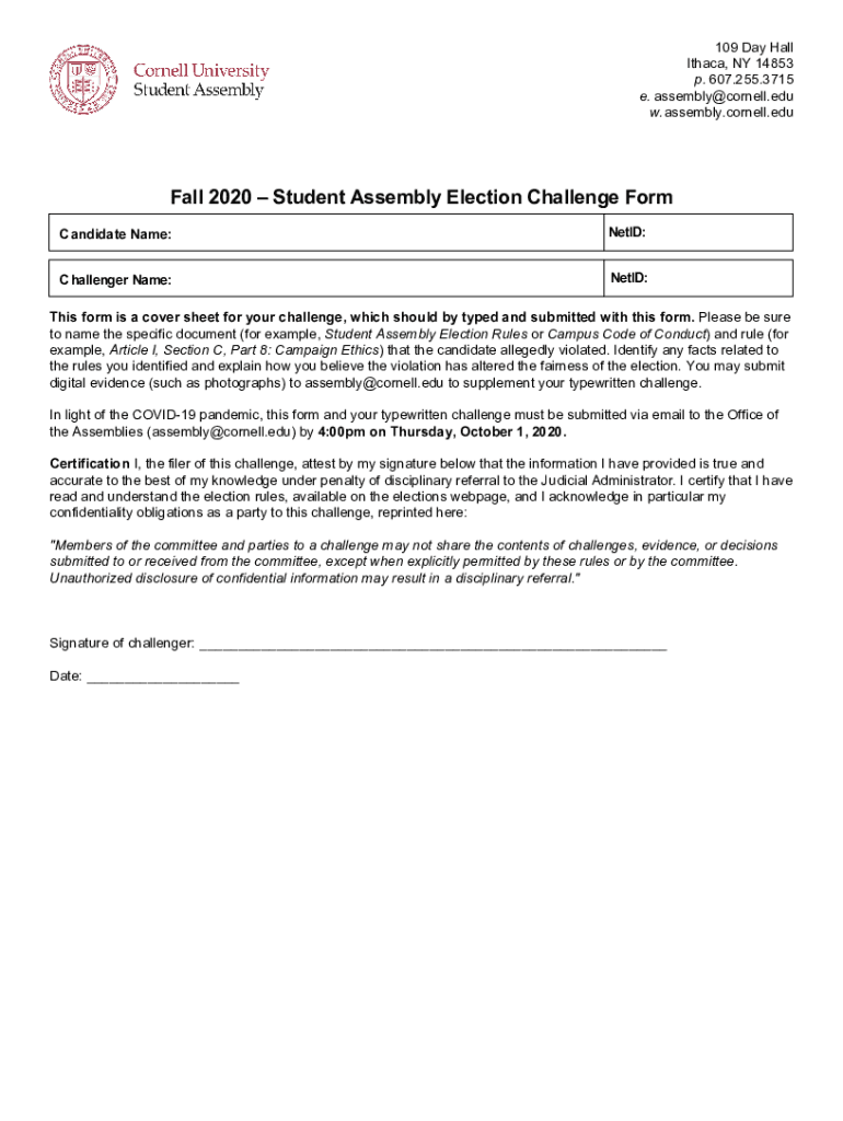 Get the free SA Election Spring 2020 Challenge Form - assembly.cornell.edu - assembly cornell