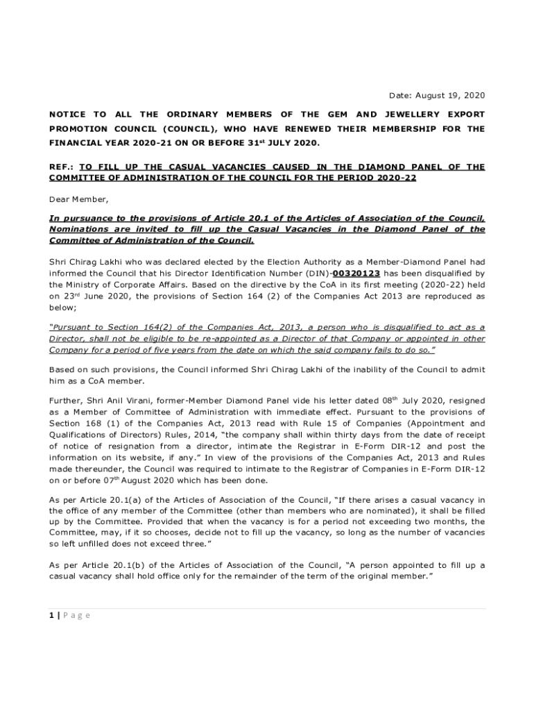 NOTICETOALLTHEORDINARYMEMBERSOFTHEGEMANDJEWELLERYEXPORTPROMOTION COUNCIL (COUNCIL), WHO HAVE RENEWED THEIR MEMBERSHIP FOR THE