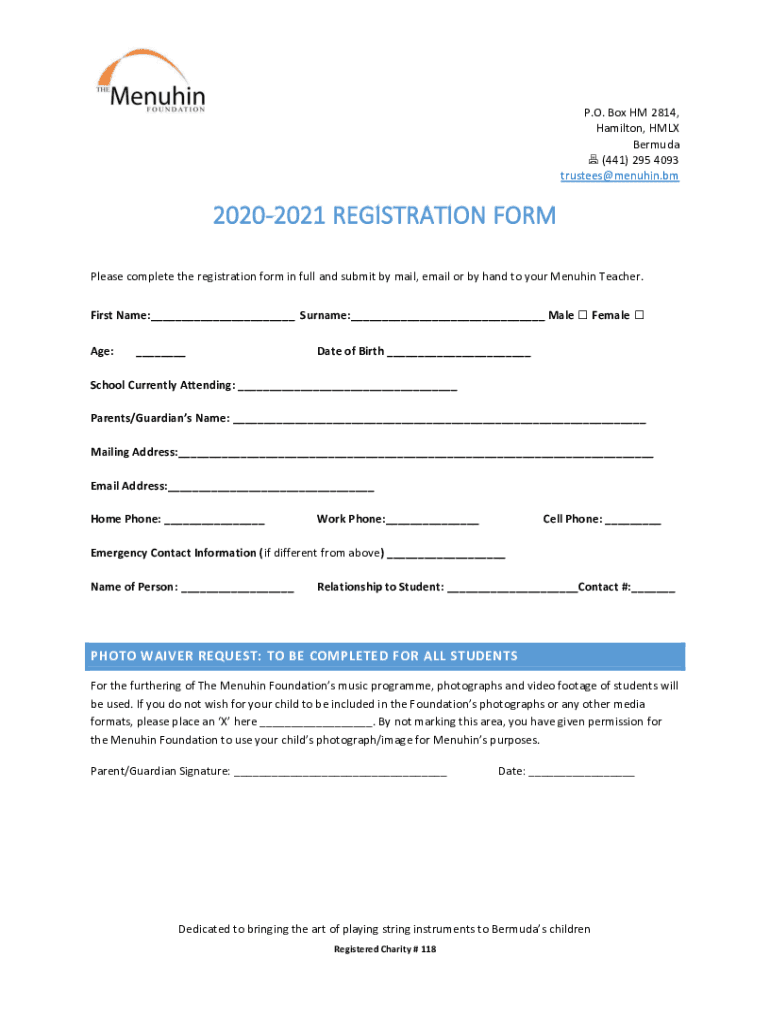P.O. Box HM 2814, Hamilton, HM LX Bermuda (441) 295 4093 trustees Menuhin.bm20202021 REGISTRATION FORM Please complete the registration form in full and submit by mail, email or by hand to your Menuhin