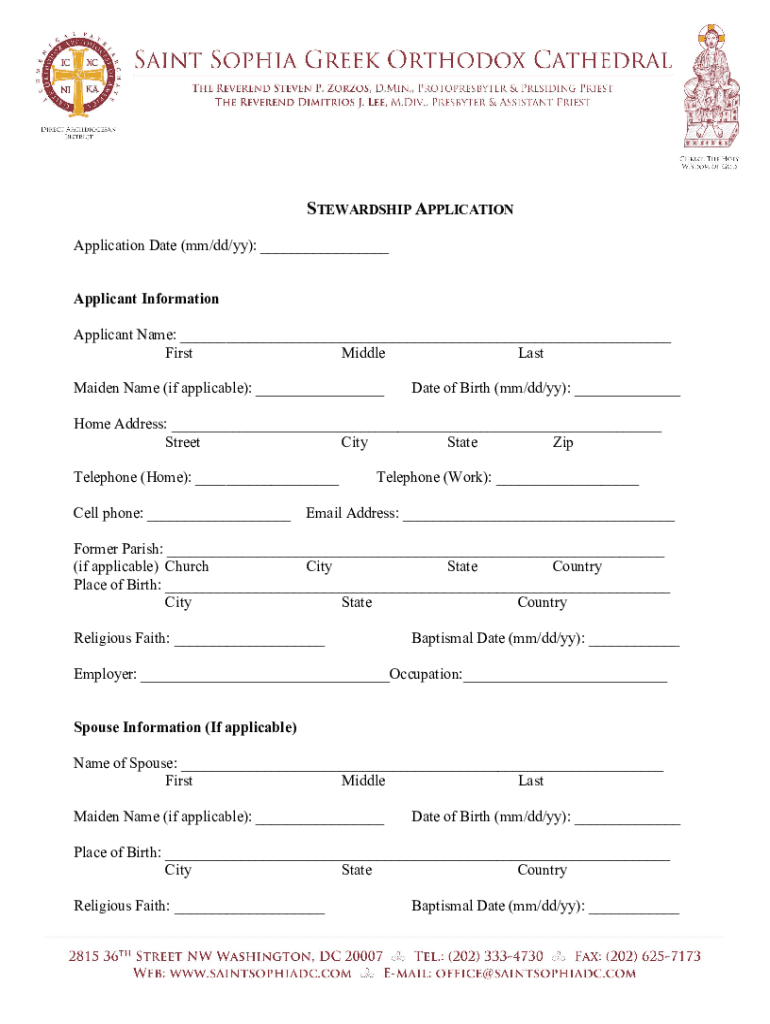 STEWARDSHIP APPLICATION Date (mm/dd/by): Applicant Information Applicant Name: First Middle Last Maiden Name (if applicable): Date of Birth (mm/dd/by): Home Address: Street City State Zip Telephone