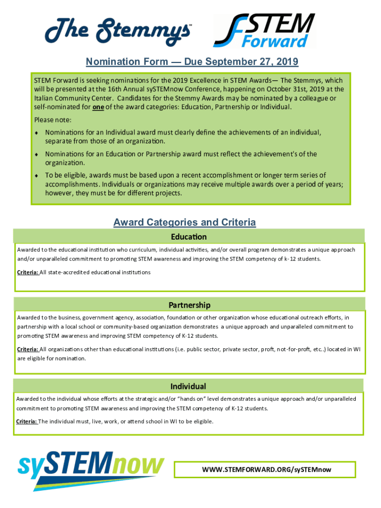 Nomination Form Due September 27, 2019, STEM Forward is seeking nominations for the 2019 Excellence in STEM Awards The Stem mys, which will be presented at the 16th Annual system Conference, happening