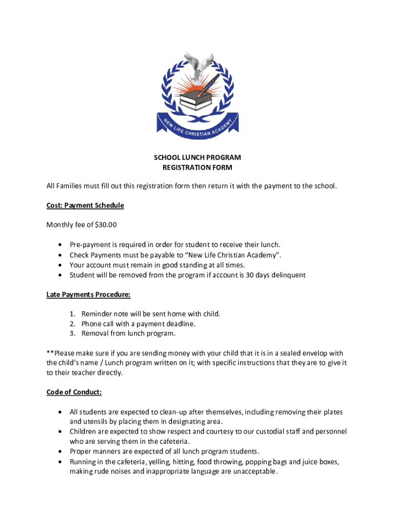 SCHOOL LUNCH PROGRAM REGISTRATION FORM All Families must fill out this registration form then return it with the payment to the school. Cost: Payment Schedule Monthly fee of $30.00 Prepayment is required