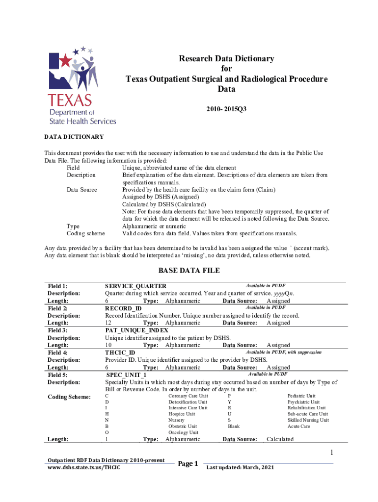 Get the free Research Data Dictionary for Texas Outpatient Surgical and ...
