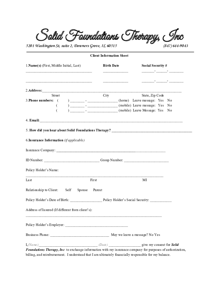 Solid Foundations Therapy, Inc5201 Washington St, suite 2, Downers Grove, IL 60515(847) 6449043Client Information Sheet 1. Name(s) (First, Middle Initial, Last) Birth Date Social Security # 2. Address: