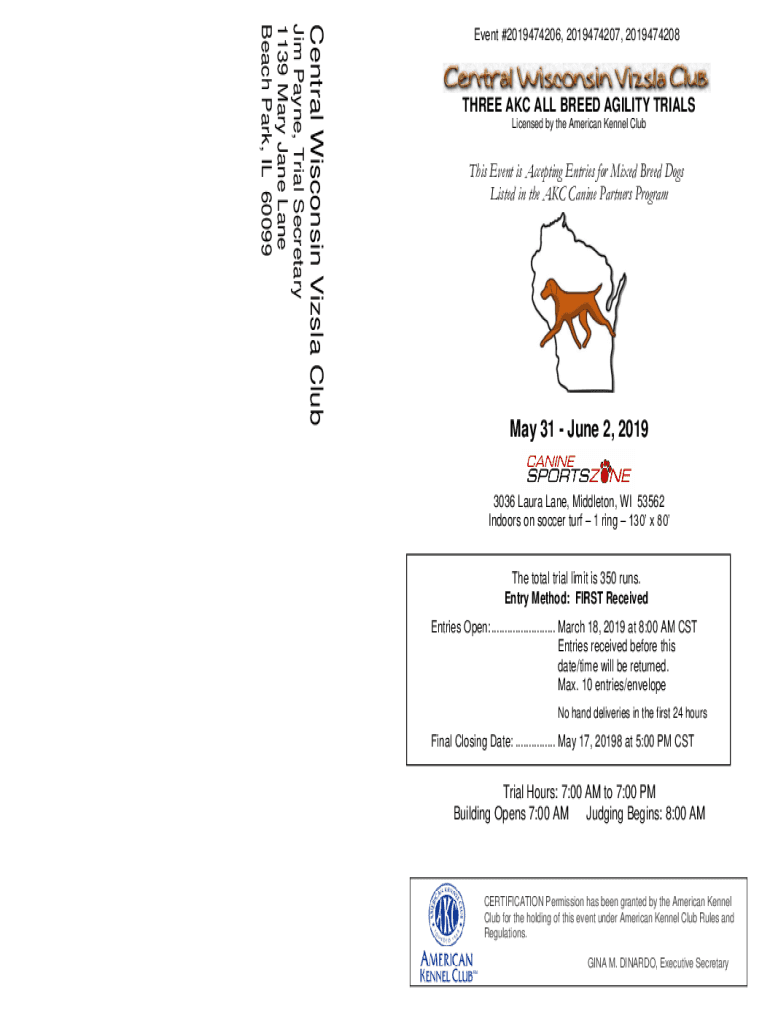 Central Wisconsin Villa Club Jim Payne, Trial Secretary 1139 Mary Jane Lane Beach Park, IL 60099Event #2019474206, 2019474207, 2019474208THREE AKC ALL BREED AGILITY TRIALS Licensed by the American