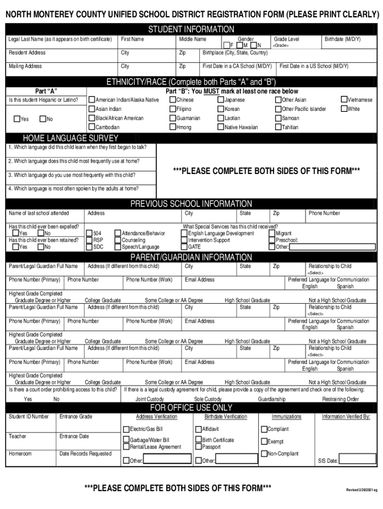 NORTH MONTEREY COUNTY UNIFIED SCHOOL DISTRICT REGISTRATION FORM (PLEASE PRINT CLEARLY)