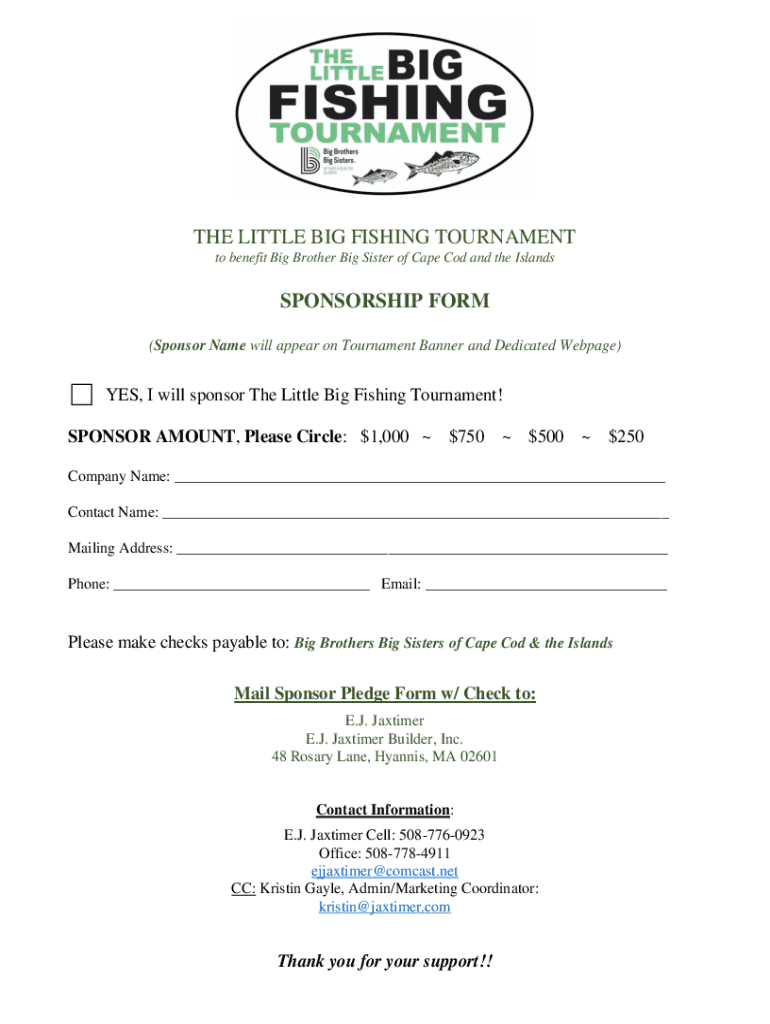 THE LITTLE BIG FISHING TOURNAMENT to benefit Big Brother Big Sister of Cape Cod and the IslandsSPONSORSHIP FORM (Sponsor Name will appear on Tournament Banner and Dedicated Webpage)YES, I will sponsor