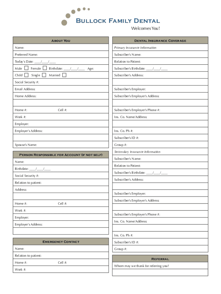 Bullock Family Dental Welcomes You! About Dental Insurance CoverageName:Primary Insurance InformationPreferred Name:Subscribers Name:Today's Date: / / Relation to Patient:MaleFemaleBirthdate: / /