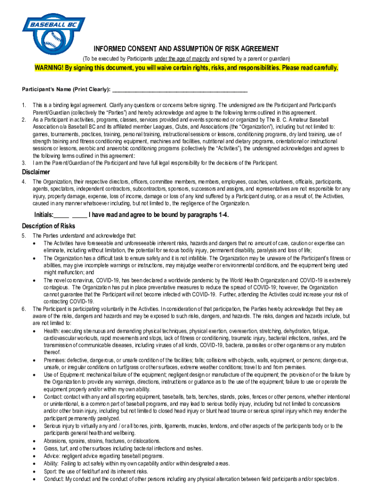 INFORMED CONSENT AND ASSUMPTION OF RISK AGREEMENT (To be executed by Participants under the age of majority and signed by a parent or guardian)WARNING! By signing this document, you will waive certain