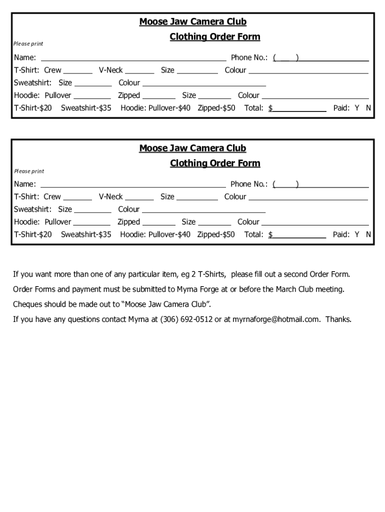 Moose Jaw Camera Club Clothing Order Formulas printable: Phone No.: () Shirt: Crew Neck Size Color Sweatshirt: Size Color Hoodie: Pullover Zipped Size Color TShirt$20Sweatshirt$35Hoodie: Pullover$40