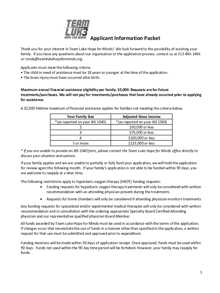 Applicant Information Packet Thank you for your interest in Team Luke Hope for Minds! We look forward to the possibility of assisting your family. If you have any questions about our organization