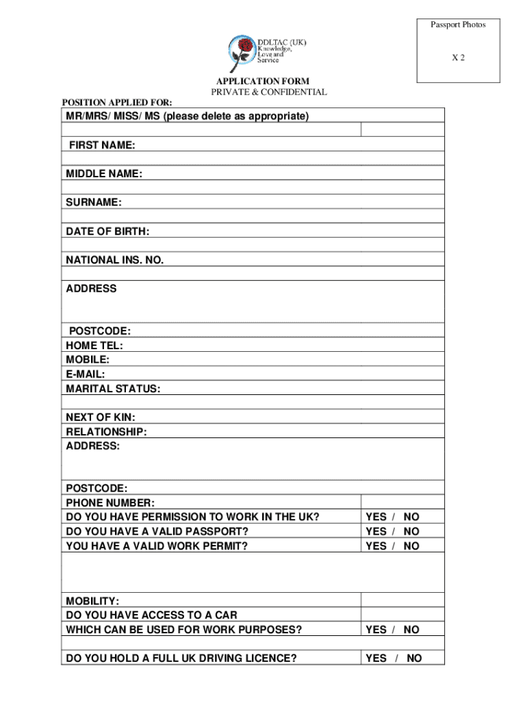 Passport PhotosX2APPLICATION FORM PRIVATE & CONFIDENTIAL POSITION APPLIED FOR:MR/MRS/ MISS/ MS (please delete as appropriate) FIRST NAME: MIDDLE NAME: SURNAME: DATE OF BIRTH: NATIONAL INS. NO. ADDRESSPOSTCODE: