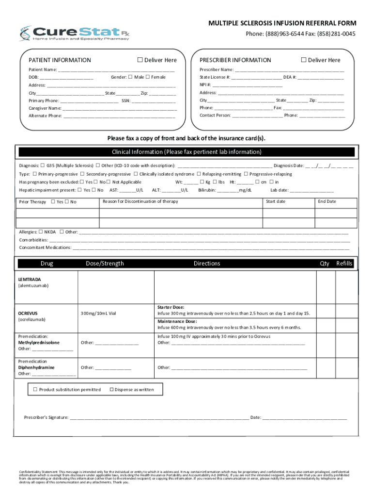 MULTIPLE SCLEROSIS INFUSION REFERRAL FORM Phone: (888)9636544 Fax: (858)2810045 Deliver Impatient INFORMATIONPatient Name: Deliver HerePrescriber Name: Gender: Male Female DOB: PRESCRIBER INFORMATIONState